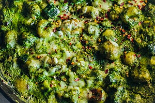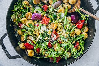 Golden pan-fried gnocchi tossed with grilled summer veg and a divine green salad dressing!