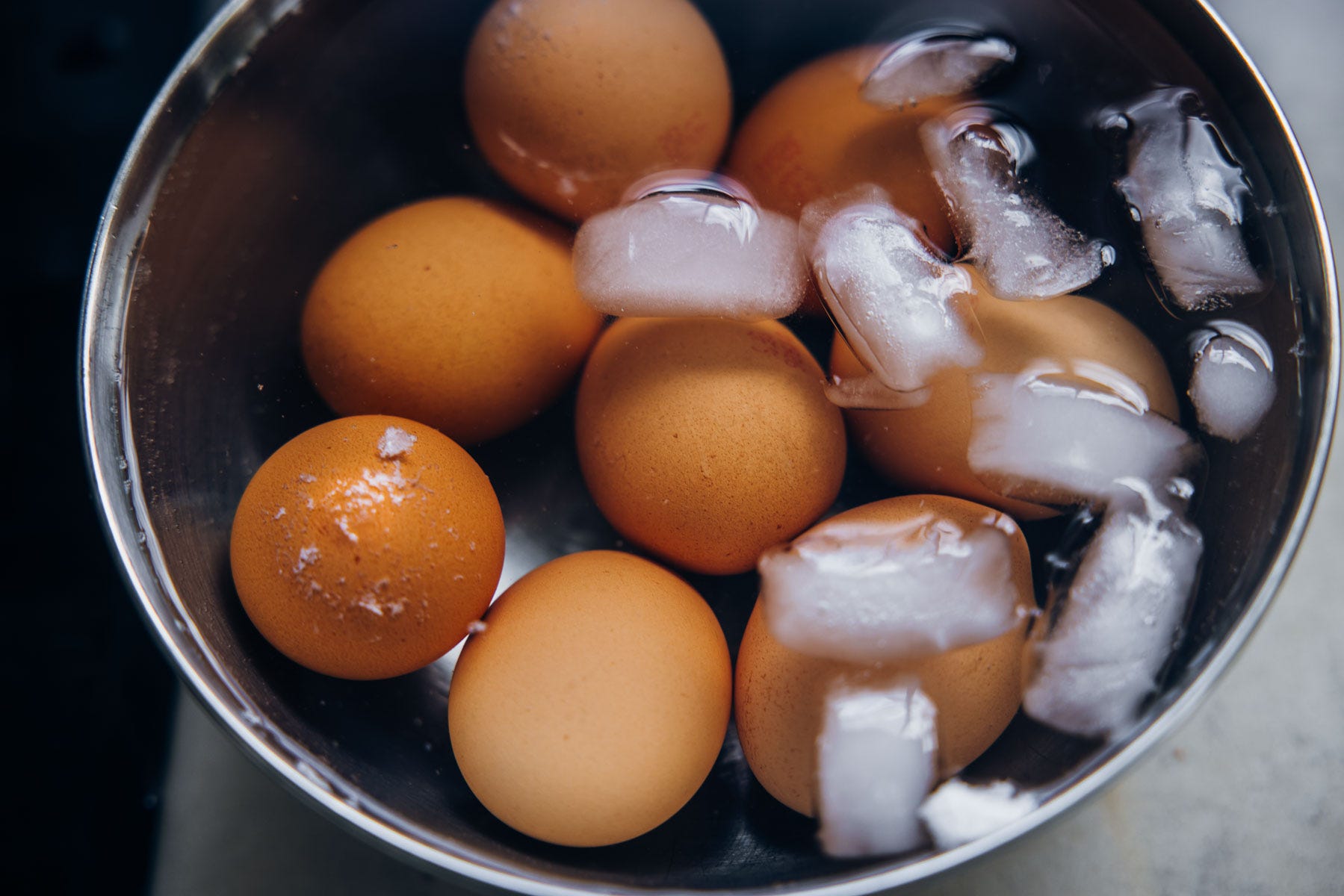 Bring a pot of water to a boil. Gently drop in the eggs with a slotted spoon, ensuring that they don’t hit the bottom and crack. Boil for 7 minutes. Using the slotted spoon, remove the eggs to a bowl filled with chilled water and ice. Allow eggs to cool in this bowl for 5-10 minutes before peeling and slicing in half.