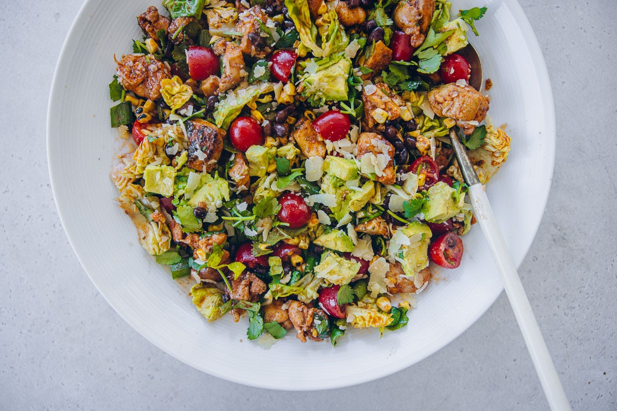 This is the most delicious Mexican Chicken Salad you will make. Perfect for adding to your weekly cooking roster. Succulent, grilled chicken tossed with beans, corn, tomatoes, lettuce, avocado and a delicious spicy, smoky Mexican Salad Dressing. Topped with fresh coriander and parmesan, it is incredibly yummy warm or cold and takes only 20 minutes to make.