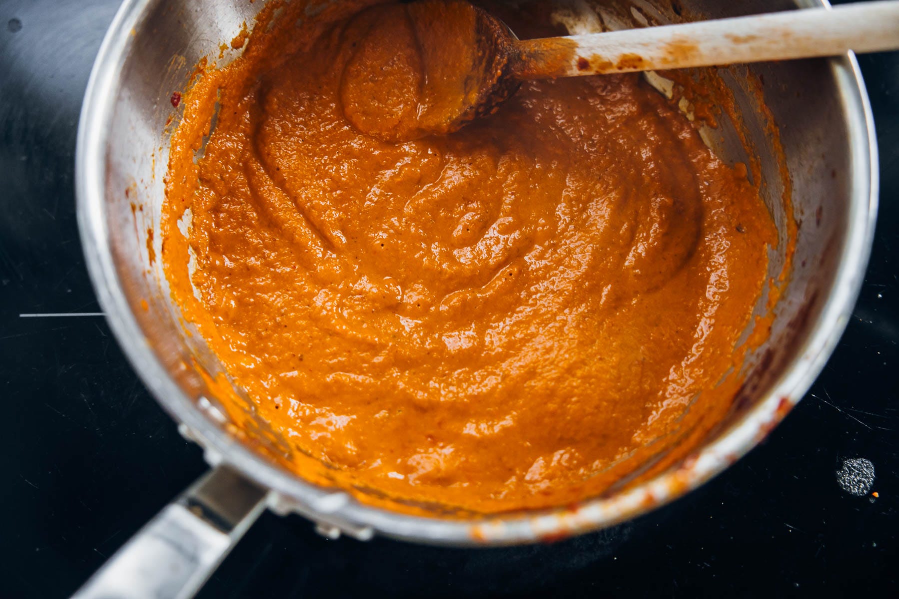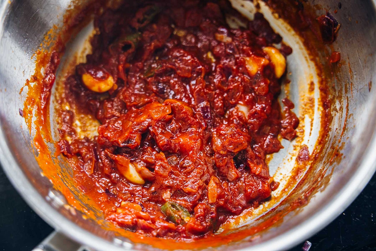 Add tomato paste, turmeric, coriander, garam masala, paprika, cardamom, salt and sugar. Mix and cook for 5-6 minutes. Add ¾ cup of water and cook for another 4-5 minutes. Remove from heat, cool slightly and blend to a smooth sauce.