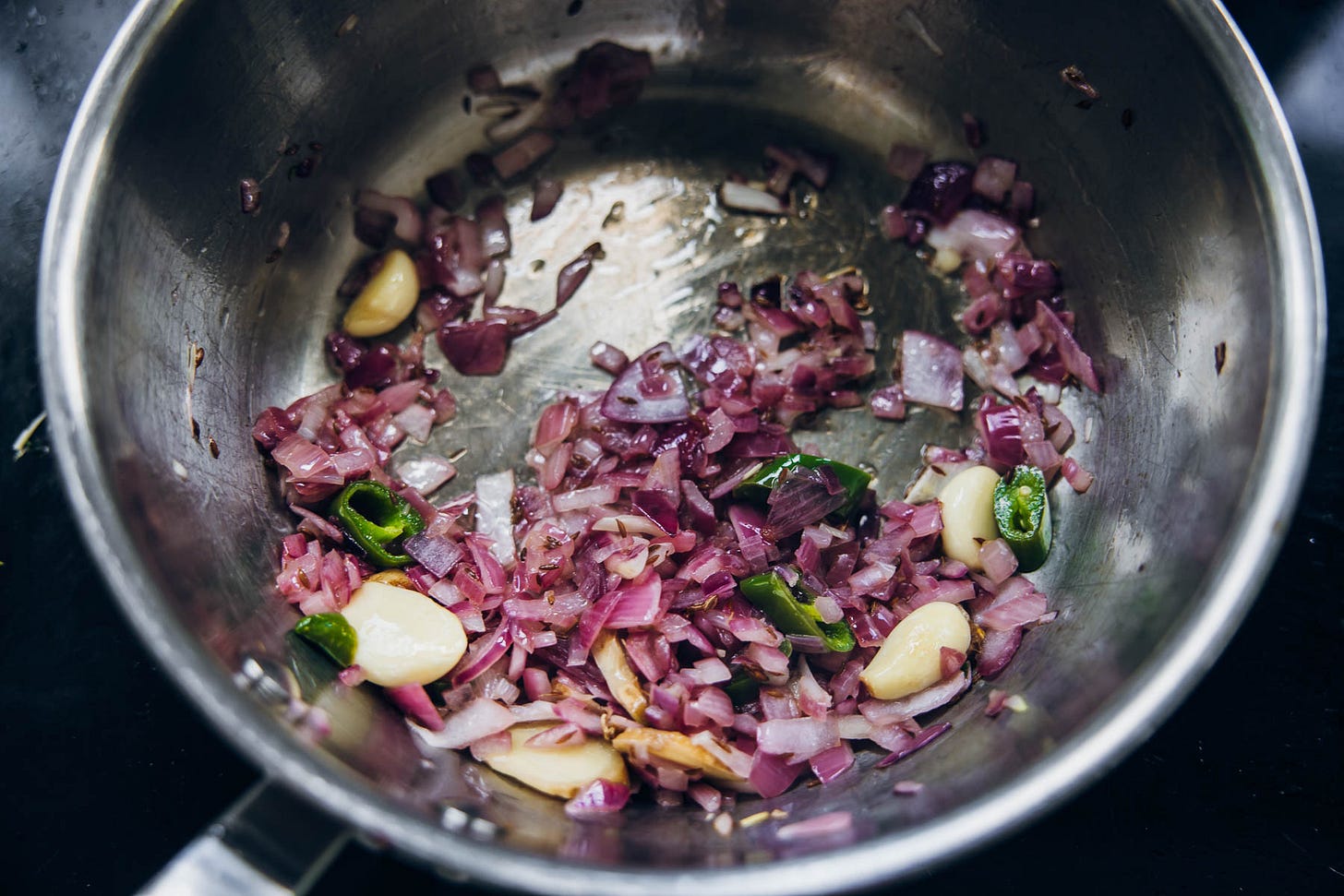 Heat the ghee in a heavy-bottomed saucepan on medium. Add cumin seeds, chilli, garlic and ginger. Sauté for a few seconds until fragrant. Add onion, mix and cook on medium-low for 10-12 minutes until onion is caramelised.